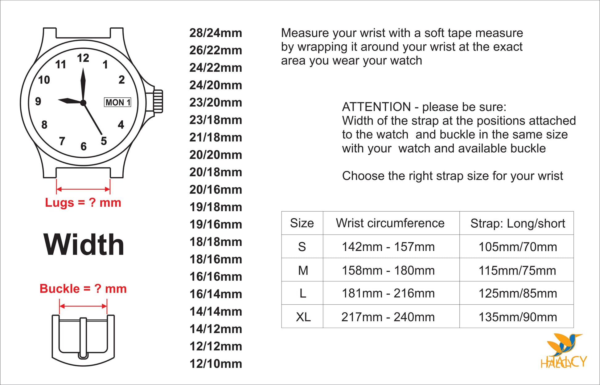 - Mẫu dây này tương thích với bất kỳ đồng hồ truyền thống hoặc đồng hồ thông minh nào cỡ 16mm, 18mm, 20mm, 22mm , 24mm,... và có thể được tích hợp vào dây đeo. Vì vậy việc biết chính xác size phần kết nối với dây đeo và phần kết nối với khóa đồng hồ của bạn là quan trọng nhất